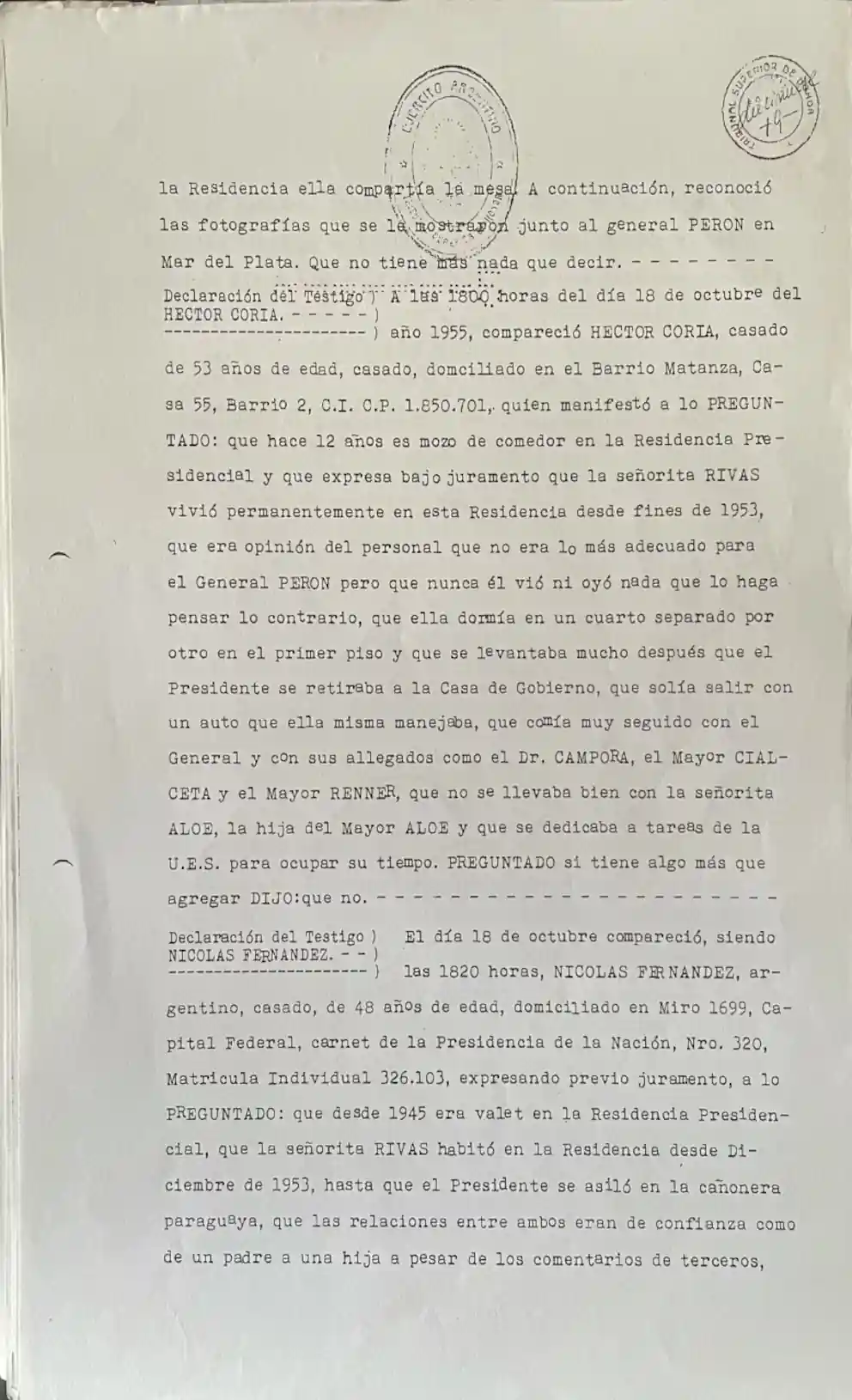 “Fojas 19. Declaración del Testigo HÉCTOR CORIA. A las 18 horas del día 18 de octubre del año 1955, (…) quien manifestó a lo PREGUNTADO: que hace 12 años es mozo de comedor de la Residencia Presidencial y que expresa bajo juramento que la señorita RIVAS vivió permanentemente en esta Residencia desde fines de 1953, que era opinión del personal que no era lo más adecuado para el General PERÓN pero que nunca él vio ni oyó nada que lo haga pensar lo contrario, que ella dormía en un cuarto separado por otro en el primer piso y que se levantaba mucho después que el Presidente se retiraba a la Casa de Gobierno, que solía salir con un auto que ella misma manejaba, que comía muy seguido con el General y con sus allegados como el Dr. CÁMPORA, el Mayor CIALCETA y el Mayor RENNER, (…)” (sic).