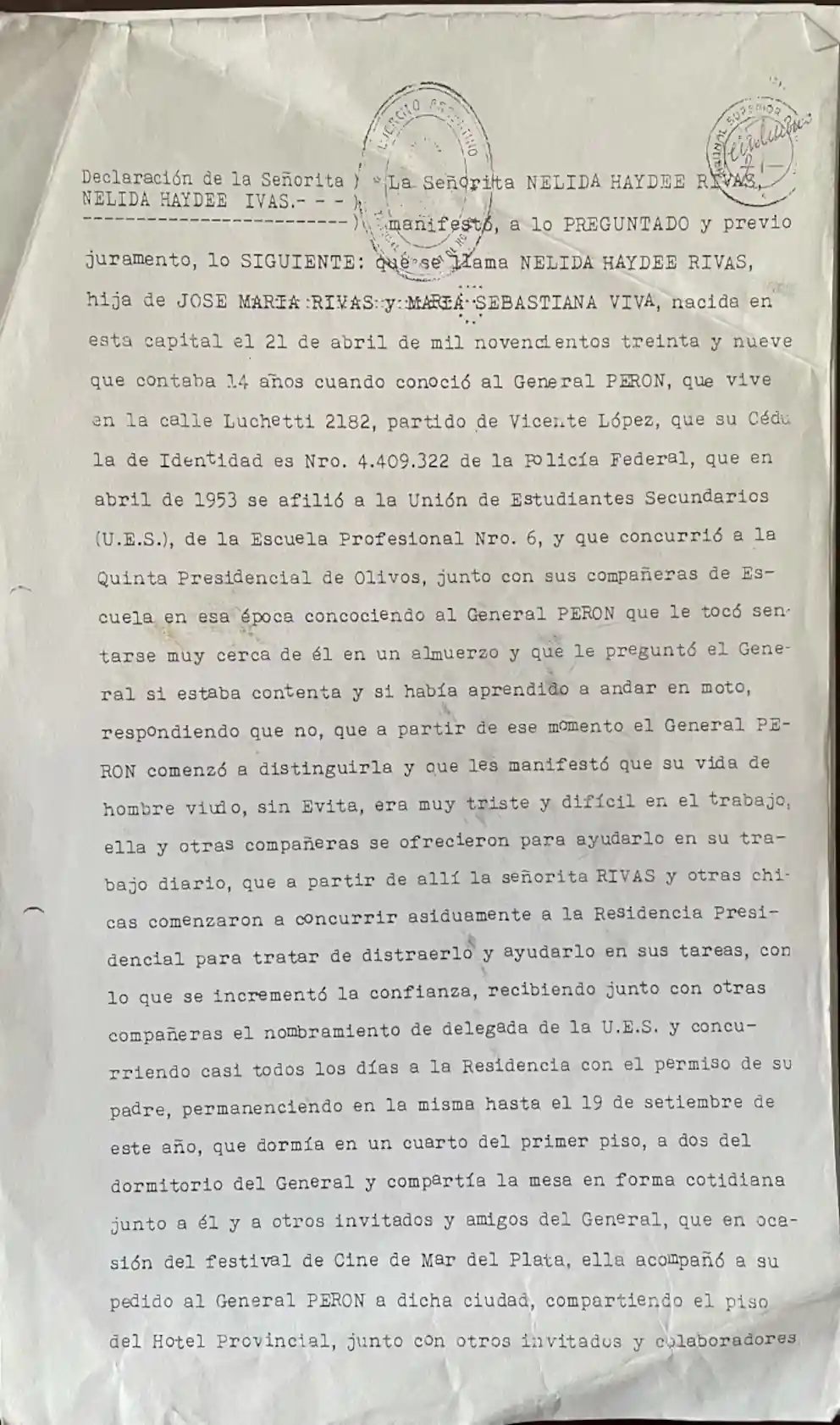 «Fojas 21/22. Declaración de NÉLIDA HAYDEE RIVAS. (…) que en abril de 1953 se afilió a la Unión de Estudiantes Secundarios (U.E.S.) de la Escuela Profesional Nro. 6, y que concurrió a la Quinta Presidencial de Olivos, junto con sus compañeras de Escuela en esa época conociendo al General PERÓN que le tocó sentarse muy cerca de él en un almuerzo y que le preguntó el General si estaba contenta y si había aprendido a andar en moto (…) ella y otras compañeras se ofrecieron para ayudarlo en su trabajo diario, que a partir de allí la señorita RIVAS y otras chicas comenzaron a concurrir asiduamente a la Residencia Presidencial para tratar de distraerlo y ayudarlo en sus tareas, con lo que se incrementó la confianza, recibiendo junto con otras compañeras el nombramiento de delegada de la U.E.S. y concurriendo casi todos los días a la Residencia con el permiso de su padre, permaneciendo en la misma hasta el 19 de septiembre de este año, que dormía en un cuarto del primer piso, a dos del dormitorio del General y compartía la mesa en forma cotidiana junto a él y a otros invitados y amigos del General, que en ocasión del festival de Cine de Mar del Plata, ella acompañó a su pedido al General PERÓN, a dicha ciudad, compartiendo el piso del Hotel Provincial, junto con otros invitados y colaboradores, que mientras vivió en la Residencia el General la trataba como un padre y que se aburría mucho, que muchas veces iba a la casa de sus padres en el auto que le facilitaba el Mayor RENNER, que iba muy poco a la U.E.S. (…)” (sic).