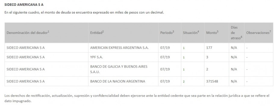 La empresa SIDECO Americana, emblema histórico de la familia Macri, tiene acumulada con el Banco Nación una deuda de $373 millones de pesos. El banco público pasó esta deuda a la «categoría 2», con «seguimiento especial» y podría ser pasada a «categoría 3», o sea de riesgo y «con problemas». Se trata de una deuda originada en el año 2001 y reestructurada en 2003 y 2008, con cuotas a vencer hasta el año 2031, de las que ya se adeudan varias.