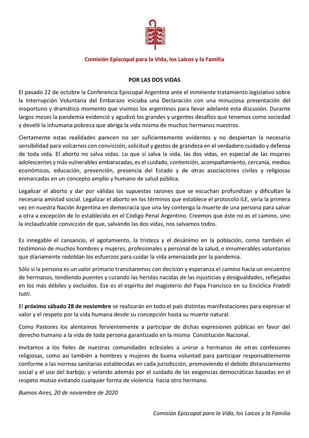 El pasado 22 de octubre la Conferencia Episcopal Argentina ante el inminente tratamiento legislativo sobre la Interrupción Voluntaria del Embarazo iniciaba una Declaración con una minuciosa presentación del inoportuno y dramático momento que vivimos los argentinos para llevar adelante esta discusión. Durante largos meses la pandemia evidenció y agudizó los grandes y urgentes desafíos que tenemos como sociedad y develó la inhumana pobreza que abriga la vida misma de muchos hermanos nuestros.