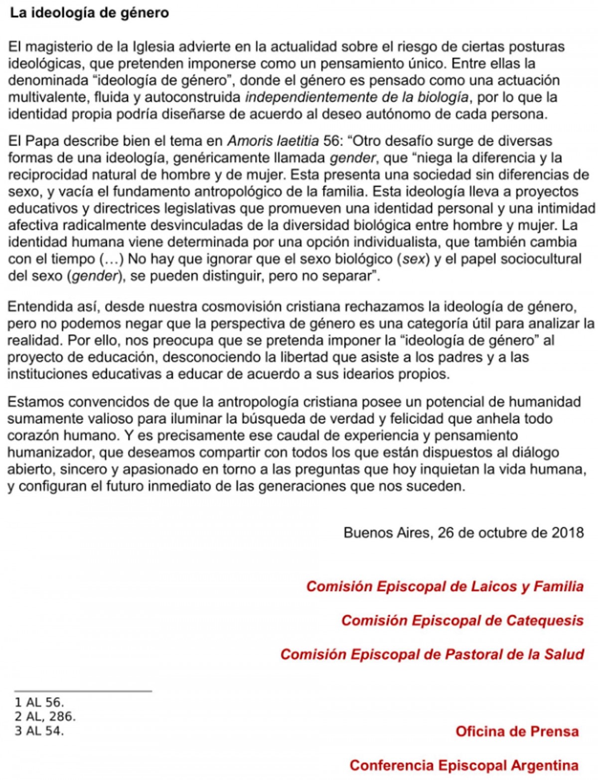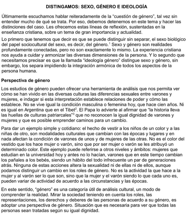 La Conferencia Episcopal Argentina manifestó su preocupación por la «imposición como pensamiento único de la ideología de género» en la educación, diferenciándola de una correcta «perspectiva de género» en la que el género se distingue pero no se separa de la condición biológica de la persona. «En la ideología de género, el género es pensado como una actuación multivalente, fluida y autoconstruida independientemente de la biología, por lo que la identidad propia podría diseñarse de acuerdo al deseo autónomo de cada persona». De este modo aclara la necesidad de una educación sexual integral en las escuelas, pero «sin ideología de género», manteniendo la posibilidad de que las escuelas puedan adaptar la misma a su ideario institucional.