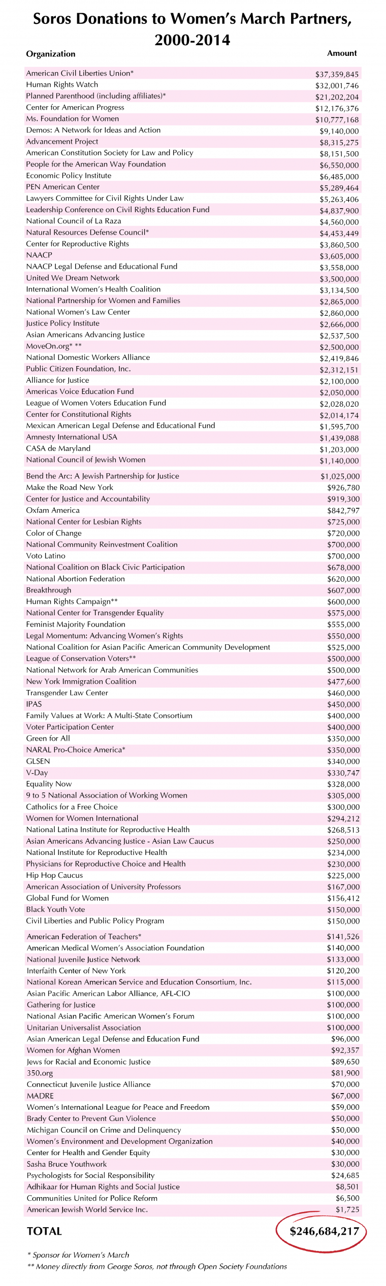 - Los socios recibieron más de $ 246 millones de George Soros: 100 de los 544 socios de la Marcha de las Mujeres recibieron un total de $ 246,637,217 de Soros entre 2000 y 2014. Soros dio más de $ 1 millón a 36 de esos socios, incluido el Centro de Derechos Reproductivos, MoveOn. org, y el Consejo de Defensa de Recursos Naturales.