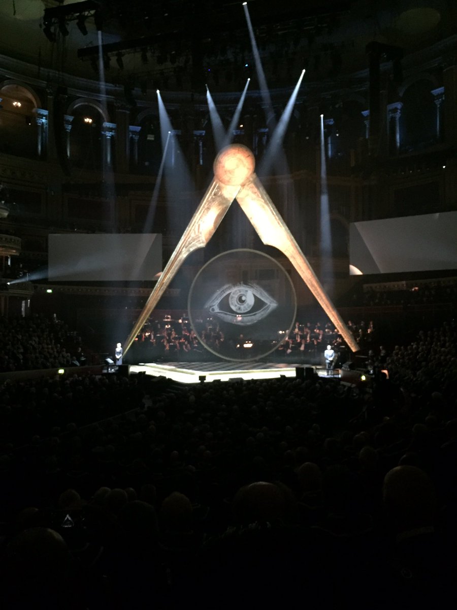 El actor británico Sir Derek Jacobi ejerció de maestro de ceremonias enmarcado en una estructura colosal con escuadra y compás bañados en oro de 20 metros de altura y la proyección gigante en holograma del Ojo que Todo lo Ve, la deidad masónica por excelencia: