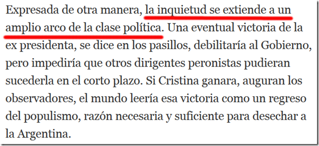¿Que como lo se?. Simple, me lo cuenta el diario La Nación en su nota del día de ayer titulada : “Si Cristina ganara en octubre”. Y le creo, por que siempre he reconocido que así como cuando alguien lee Clarín, sólo se entera de lo que le interesa y le conviene a Magneto y su grupo económico, cuando la lectura recae sobre La Nación, uno tiene la certeza de saber que piensan, les conviene y quieren las elites argentinas (sic), más popularmente conocidas como «el establishment». Es fácil, mirá lo que dice la nota: