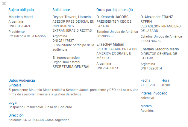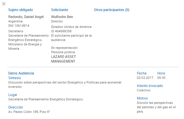 Fuente: Ámbito Financiero, 24 de marzo de 2017. En el artículo además se explica que «Lazard no sólo es importante por su tenencia en YPF. La firma fue la responsable de conseguirle un comprador a IECSA, la constructora de Ángelo Calcaterra, el primo del presidente Mauricio Macri. Hace apenas algunos días se confirmó la adquisición de esa firma por parte de un grupo integrado por cuatro de los principales accionistas del holding energético Pampa Energía».