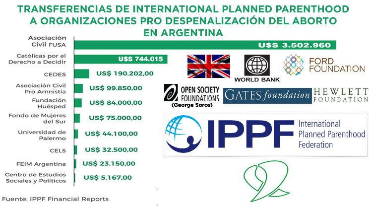 Otras entidades subvencionadas por IPPF son el Fondo de Mujeres del Sur (u$s 75.000), CELS – Centro de Estudios Legales y Sociales (u$s 32.500), FEIM Argentina (u$s 23.150) y el Centro de Estudios Sociales y Políticos Para el Desarrollo Humano (u$s 5.167). La IPPF a su vez recibe financiación de: Gates Foundation, Hewlett Foundation, Packard Foundation, Ford Foundation y los Gobiernos de Gran Bretaña y Holanda. En el caso del CELS, este organismo recibió además U$S 1.340.000 de Soros y $1.750.000 de la Fundación Ford solo en 2017, situación que se viene repitiendo año tras año, lo que permite explicar también la postura de medios como Página/12 con gran parte de sus periodistas socios de la entidad.