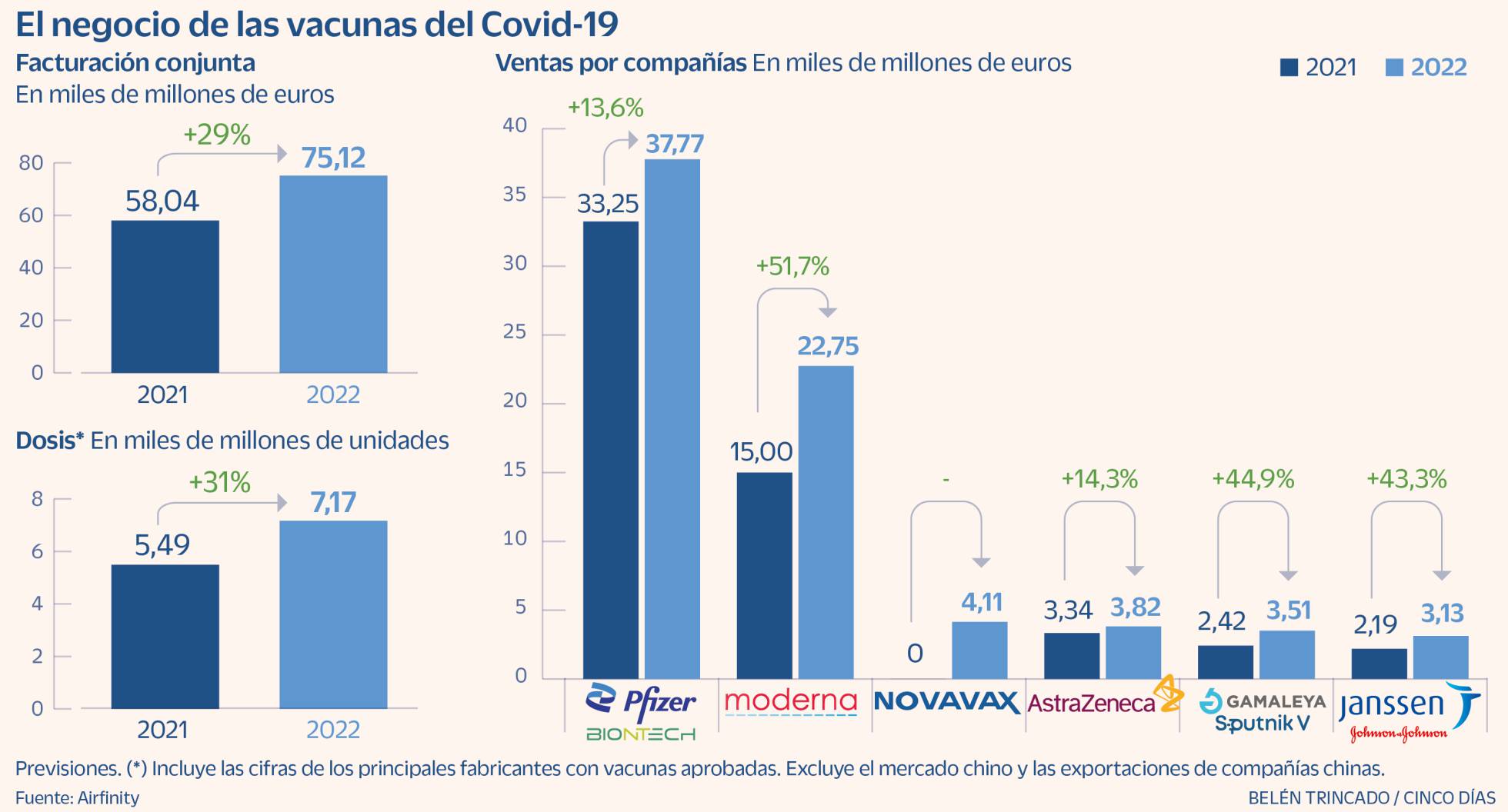 Un negocio que no existía en 2020, el de las inoculaciones contra el Covid-19, aportará este año 2022 alrededor de U$S 83.580 millones de dólares a los grandes fabricantes. Se trata de un salto de un 29% respecto a la estimación de lo que habían facturado solo por ese concepto estas mismas compañías en 2021, el primer año que se comenzaron a comercializar ampliamente, según las cifras de un informe de la consultora Airfinity. Esta empresa analiza el mercado, excluyendo a los laboratorios chinos así como los de la India, por lo que el monto global del negocio es incluso mayor. Se trata de un análisis del negocio de las opciones de Pfizer/BioNTech, Moderna, Novavax, AstraZeneca, la rusa Gamaleya (impulsor de Sputnik V) y Johnson & Johnson, excluyendo a grandes productores como las firmas chinas Sinovac y Sinopharm, y la india Bharat, entre otras.