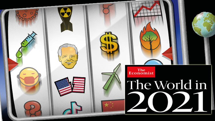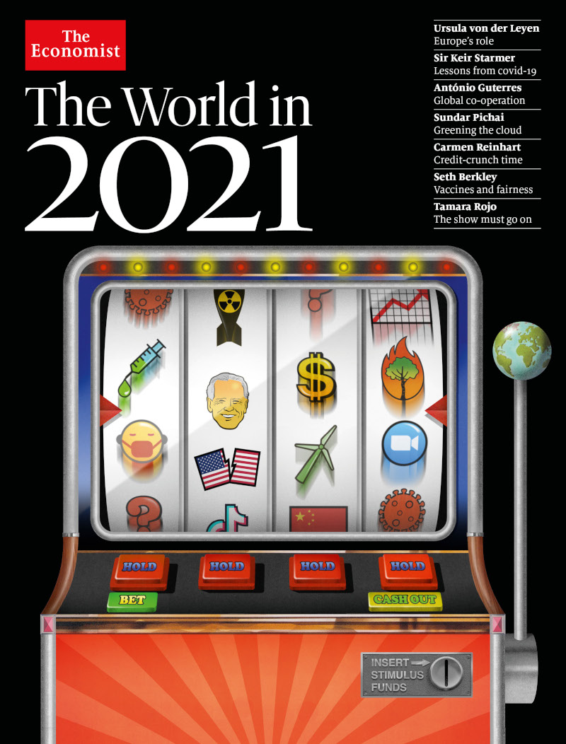 En sus proyecciones para el año 2021, The Economist muestra el mundo insertado en un gran casino global. Plagado de incertidumbre, como la de una máquina tragamonedas, nos ofrece también distintos posibles casilleros con los elementos más importantes de lo que podría ocurrir.