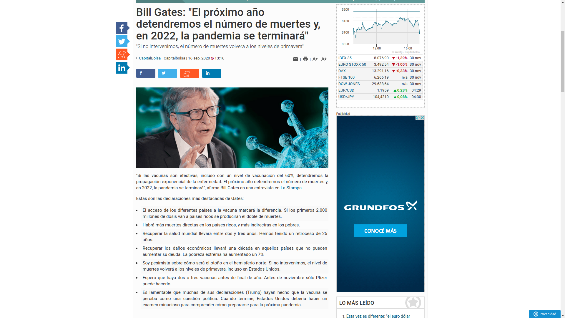 4-La vacuna. Dentro de este contexto la primera columna nos muestra una vacuna, saliendo por la mitad su contenido. Una forma de mostrar que será el año de vacunaciones masivas a millones de personas en todo el mundo, pero no todos terminarán siendo vacunados. El propio Bill Gates, principal financista de la OMS y uno de los principales lobbistas globales de la vacunación ha estimado que recién en 2022 le darán fin a toda esta cuestión ya que la vacunación durará varios años. Otro elemento a considerar será el grado de obligatoriedad o no de la misma, lo que en principio parece depender de cada país, pero es sabido que irá siendo exigible de distintas formas, como requisito para los desplazamientos, renovación de documentación oficial de las personas, etc.