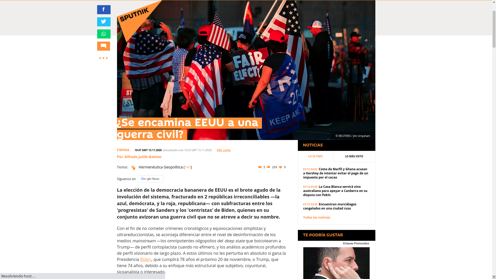 7-Bandera norteamericana partida. Siguiendo a la imagen de Biden aparece una bandera norteamericana partida al medio: si Trump insiste en permanecer en la presidencia aduciendo que hubo fraude y si la Corte Suprema terminara dándole la razón, a The Economist poco le interesa, el resultado será una inevitable guerra civil.