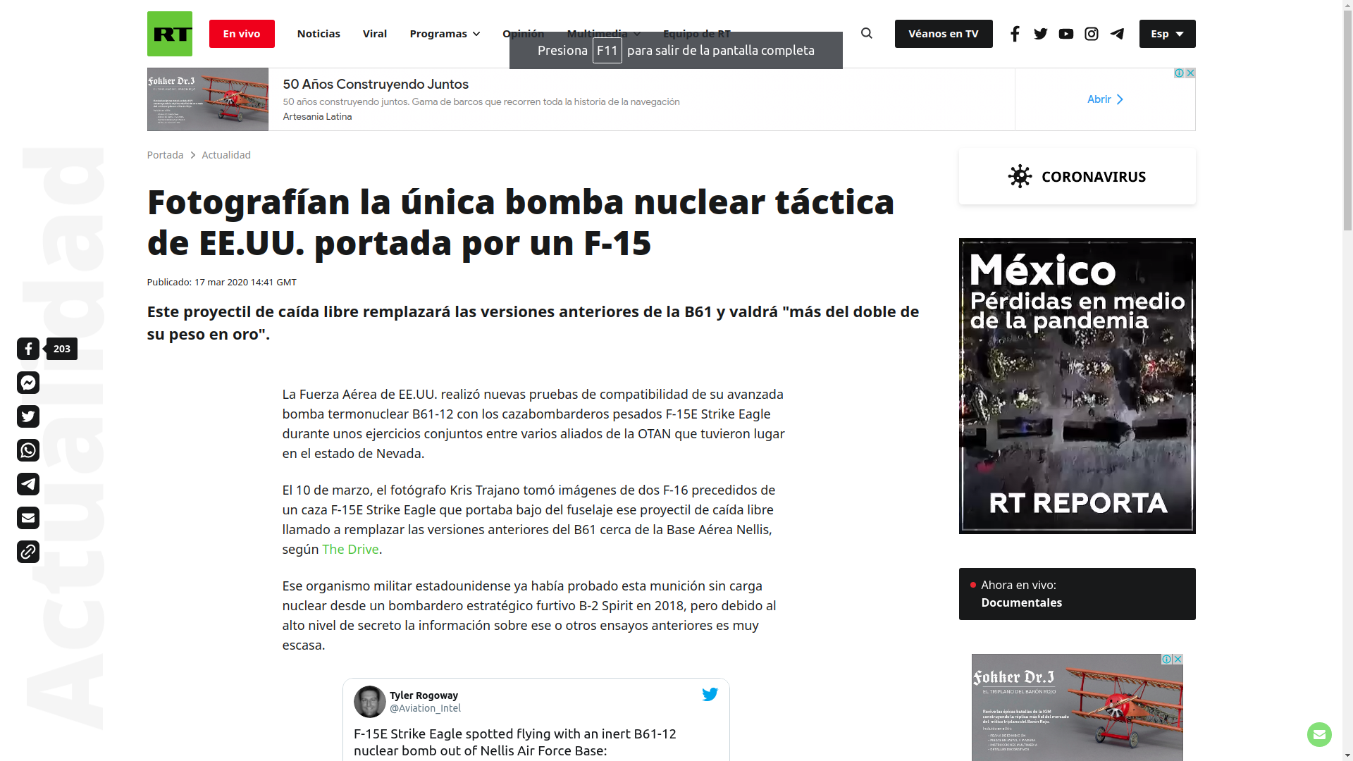 8-Arma nuclear. Por si todo esto fuera poco, The Economist se da el lujo de directamente amenazar, en la misma columna relativa a la presidencia de EEUU con una imagen de una bomba atómica. Muchos analistas sostienen que el asesinato del general iraní Qasem Soleimani fue de hecho un intento del Deep State de iniciar una conflagración bélica a gran escala. Es sabido que Biden ha tenido a lo largo de su extensa historia política como senador aceitados lazos con el Complejo Industrial Militar. Este sector, tras 4 años de no encarar una guerra como las que venía desarrollando en Medio Oriente bajo los gobiernos de George Bush y Barack Obama, buscará restablecer su statuo quo belicista, regresando, de la mano de Biden al concepto de «guerra eterna». ¿Podrá incluir esto elementos nucleares? La Guerra Fría demostró que las élites no están dispuestas a un enfrentamiento de ese tipo por la «destrucción mutua asegurada», sin embargo, las nuevas armas nucleares tácticas podrían cambiar esa situación.