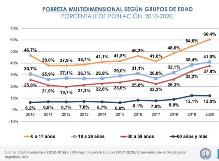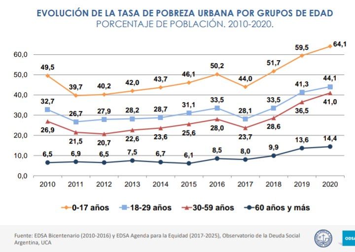De acuerdo al Observatorio de la Deuda Social de la UCA, la pobreza en la Argentina subió a un histórico 44,2%, según los datos relevados entre julio y octubre y difundidos este jueves. Un índice dramático es la pobreza de los niños y jóvenes de hasta 17 años que ya alcanza al 60,4% (64,1% en el caso de niños de población urbana). La nueva generación de argentinos muestra a un país con 6 de cada 10 personas bajo la pobreza. La indigencia sube al 16% en este rango etario, esto es: chicos que no llegan a comer de acuerdo a la canasta alimentaria básica.
