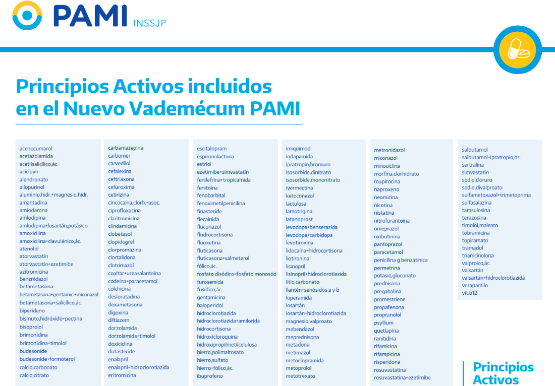 La disposición aplica a todos los jubilados y pensionados mayores de 60 años, afiliados al PAMI y que no dispongan de un servicio prepago. Para acceder a la medicación de forma gratuita deberán presentar receta, DNI y credencial. Las recetas deberán ser de tipo electrónica, conteniendo los principios activos listados en el vademecum, con la leyenda «medicamento incluido en el nuevo vademecum PAMI».