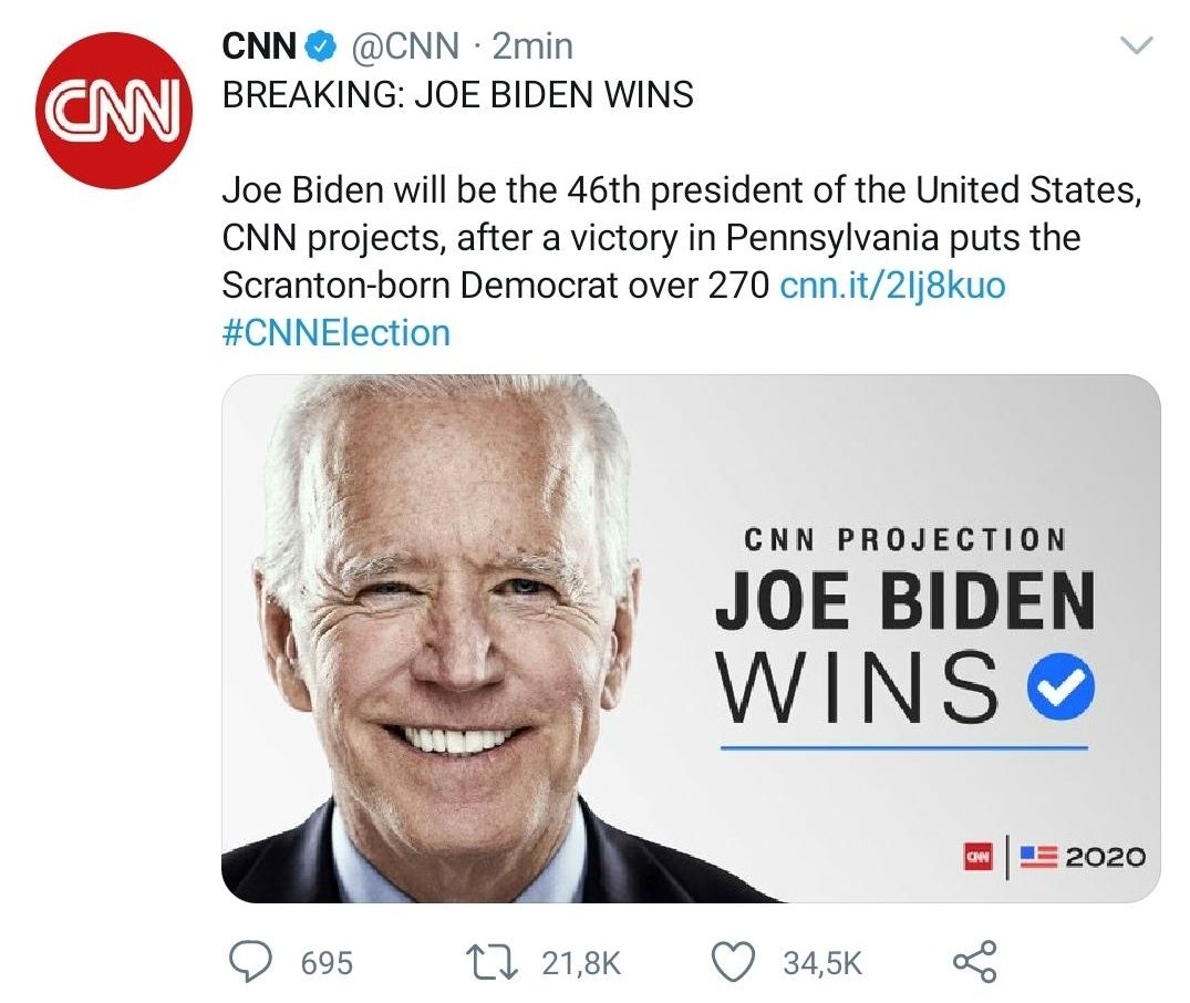 A pesar de que la Corte Suprema de EEUU comenzó a intervenir en el proceso electoral, solicitando la separación de votos por correo llegados luego del día de la elección en estados como Pennsylvania, en base a denuncias de fraude y denegación de fiscalización, las grandes cadenas de noticias de EEUU dieron por concluido el comicio y designaron como nuevo presidente electo a Joe Biden.