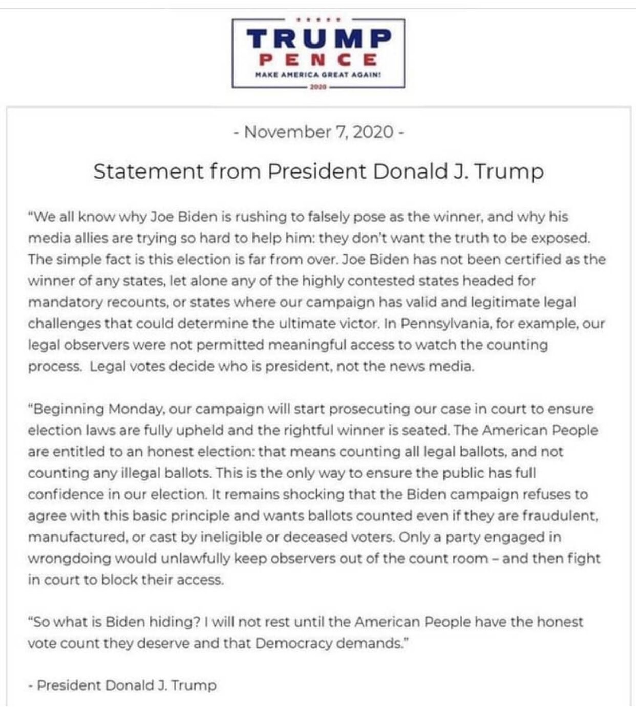 La oficina del presidente Donald Trump, por su parte, emitió un comunicado en el que anuncia que a partir del lunes comenzarán las acciones judiciales para recontar los votos en los Estados que han sido impugnados por fraude: «Todos sabemos que a Joe Biden le está entrando prisa para proclamarse ganador, y los medios aliados están intentando ayudarle: no quieren que la verdad salga a la luz», y agregó sus denuncias por la denegación de fiscalización: “A partir del lunes, nuestra campaña comenzará a procesar nuestro caso en la Corte para garantizar que las leyes electorales se cumplan plenamente y que el ganador legítimo quede asentado. El pueblo estadounidense tiene derecho a una elección honesta: eso significa contar todos los votos legales y no contar los votos ilegales. Ésta es la única manera de garantizar que el público tenga plena confianza en nuestra elección. Sigue siendo impactante que la campaña de Biden se niegue a estar de acuerdo con este principio básico y quiera que las boletas se cuenten incluso si son fraudulentas, fabricadas o emitidas por votantes no elegibles o fallecidos. Solo una parte involucrada en una infracción mantendría ilegalmente a los observadores fuera de la sala de conteo y luego pelearía en la corte para bloquear su acceso».