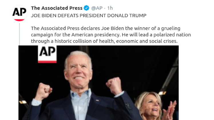 The Associated Press declares Joe Biden the winner of a grueling campaign for the American presidency. He will lead a polarized nation through a historic collision of health, economic and social crises. #APracecall pic.twitter.com/lInwqjX3PB
