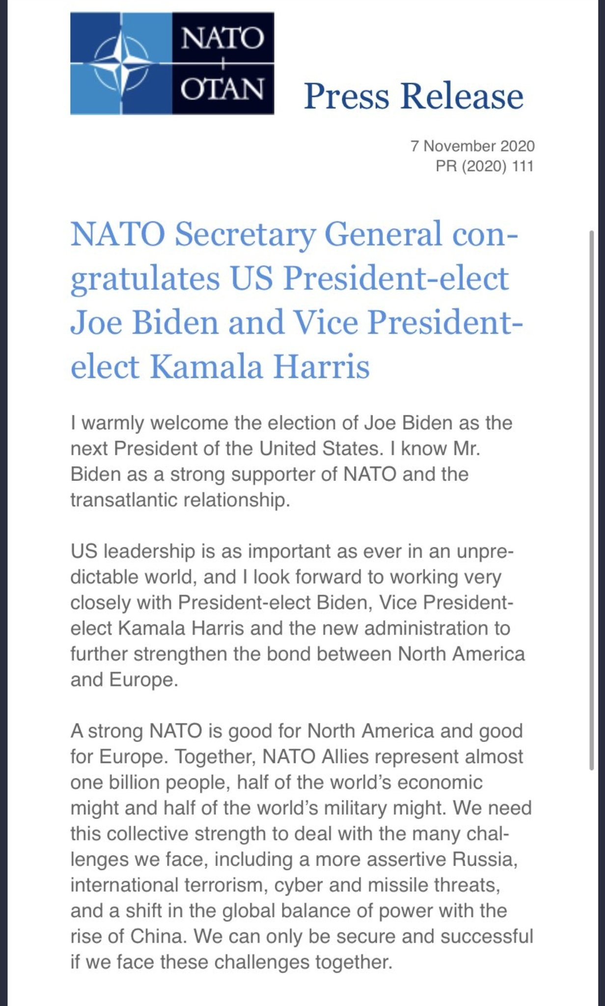 — Jens Stoltenberg (@jensstoltenberg) November 7, 2020