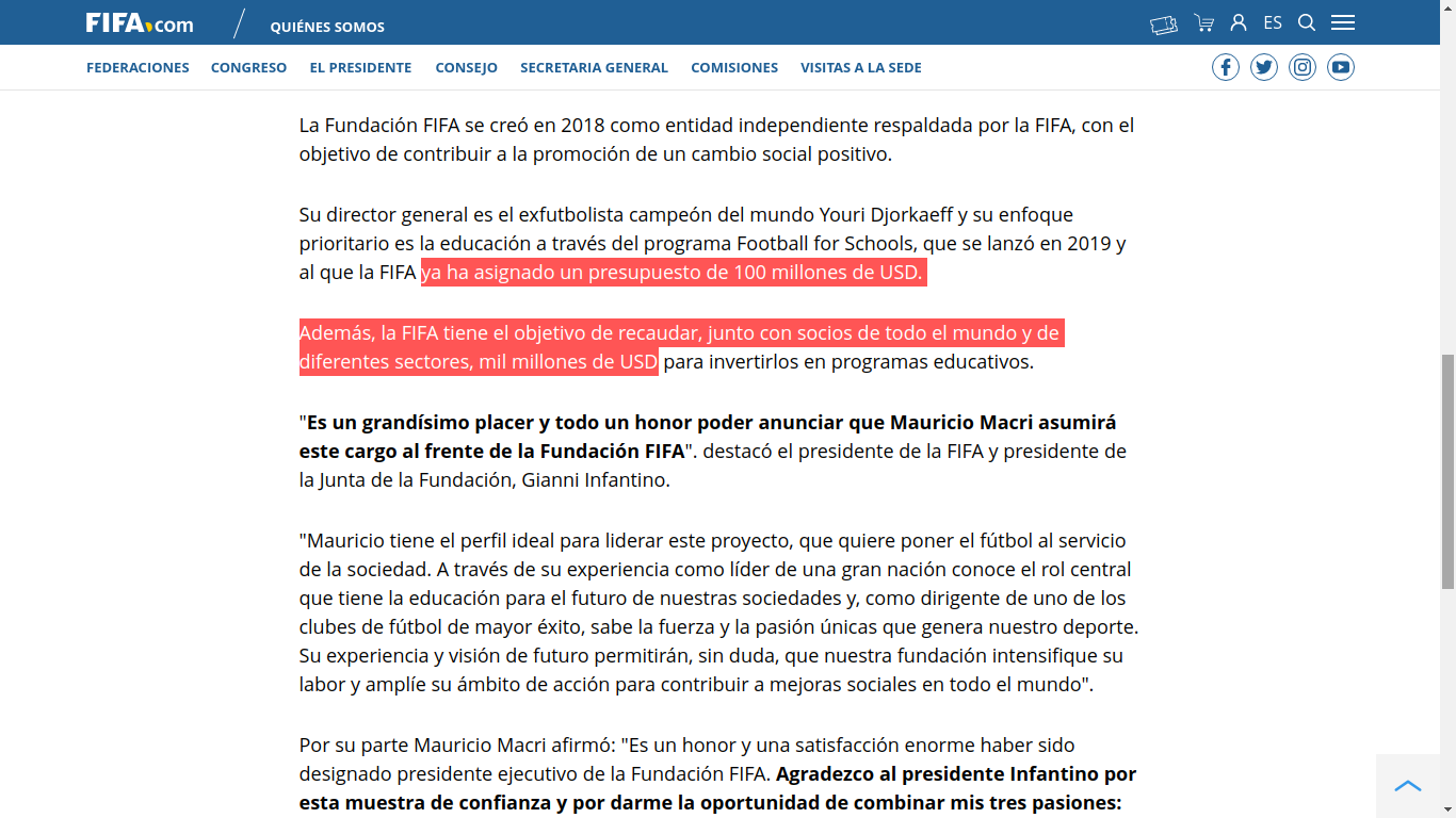 Mauricio Macri fue designado por la FIFA a cargo de su fundación, una entidad que tiene como propósitos mejorar la «infraestructura deportiva» en distintos países así como la «promoción de un cambio social positivo». Desde la AFA, Superliga y directivos de clubes de fútbol argentinos criticaron duramente esta designación, recordando que Macri además de estar involucrado en cuantiosas causas judiciales, viene de dejar un Argentina endeudada, habiendo incrementado la pobreza y la desocupación, luego de una administración que no podría estar más alejada de «un cambio social positivo». ¿Hubo por parte de la FIFA una devolución de favores?