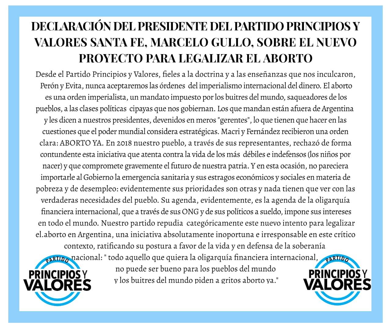 «Desde el partido Principios y Valores, fieles a la doctrina y a las enseñanzas que nos inculcaron Perón y Evita, nunca aceptaremos las órdenes del imperialismo internacional del dinero. El aborto es una orden imperialista, un mandato impuesto por los buitres del mundo, saqueadores de los pueblos, a las clases políticas cipayas que nos gobiernan. Los que mandan están afuera de Argentina y les dicen a nuestros presidentes, devenidos en meros “gerentes”, lo que tienen que hacer en las cuestiones que el poder mundial considera estratégicas».
