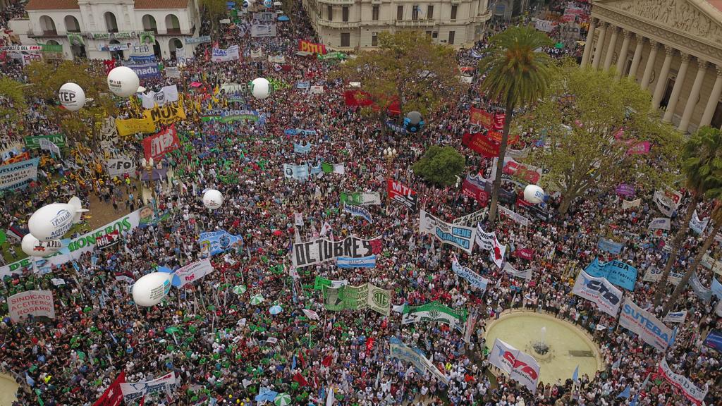 Medio millón de personas tomaron las calles para protestar contra el ajuste del gobierno liberal de Mauricio Macri y repudiar el acuerdo con el FMI. En la movilización confluyeron gremios de la CGT, del Frente Sindical y la Multisectorial 21F, como Camioneros, las dos CTA, diputados nacionales de partidos de oposición, intendentes peronistas y movimientos sociales como la CTEP, Barrios de Pie, la CCC y la Tupac Amaru.