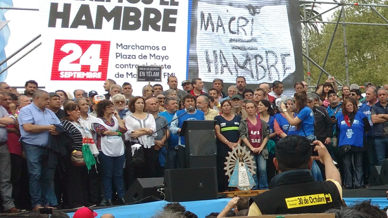 Pablo Moyano: «Nos llama la atención que haya largado su reelección en EE.UU. con Donald Trump y el Fondo Monetario Internacional. Esperemos que alguna vez (Macri) escuche al pueblo argentino, al 70 por ciento que la está pasando mal. Solo escucha a los empresarios, al FMI y no escucha esta plaza impresionante». «Esperamos que escuche. Alguna vez tiene que escuchar al 70 por ciento de los argentinos que la está pasando mal». «La CGT tiene que tener una agenda de defensa de los derechos de los trabajadores. Hoy hubo mucho gremio de la CGT, los aeronavegantes, los de la UOM, los cerveceros: a la larga o a la corta vamos a recuperar la CGT».