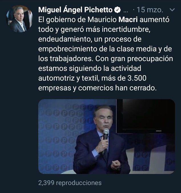 Destaqué la importancia de cumplir con las obligaciones internacionales contraídas para no caer en un nuevo default.— Miguel Ángel Pichetto (@MiguelPichetto) April 24, 2019