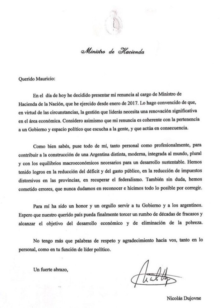 La carta de renuncia de Dujovne, en la que llama la atención la informalidad en los términos: