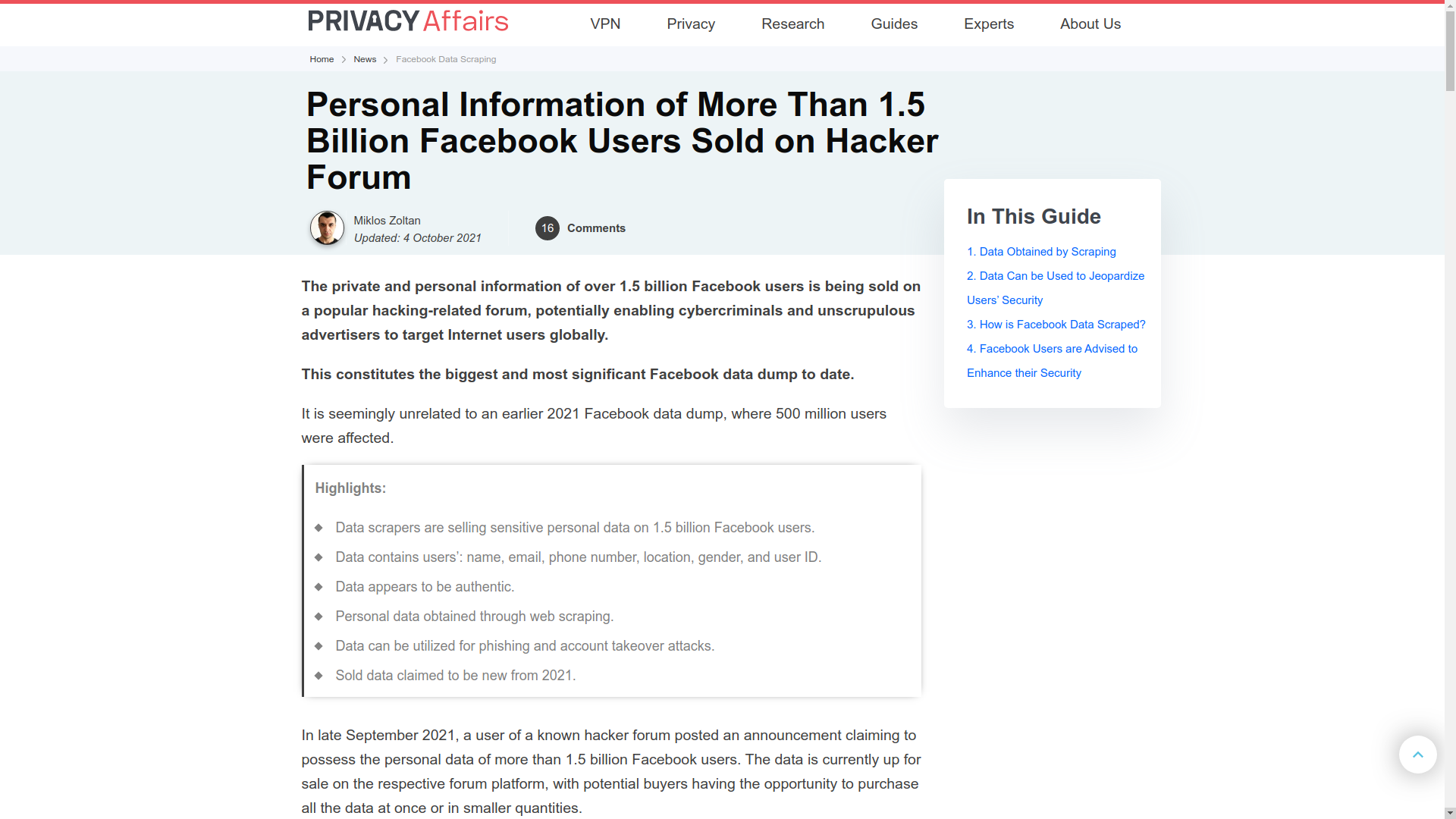 Los datos personales de más de 1.500 millones de usuarios de Facebook fueron puestos a la venta en un foro de ‘hackers’, lo que podría permitir a los ciberdelincuentes y anunciantes sin escrúpulos dirigirse a internautas de todo el mundo, según informó este lunes Privacy Affairs.