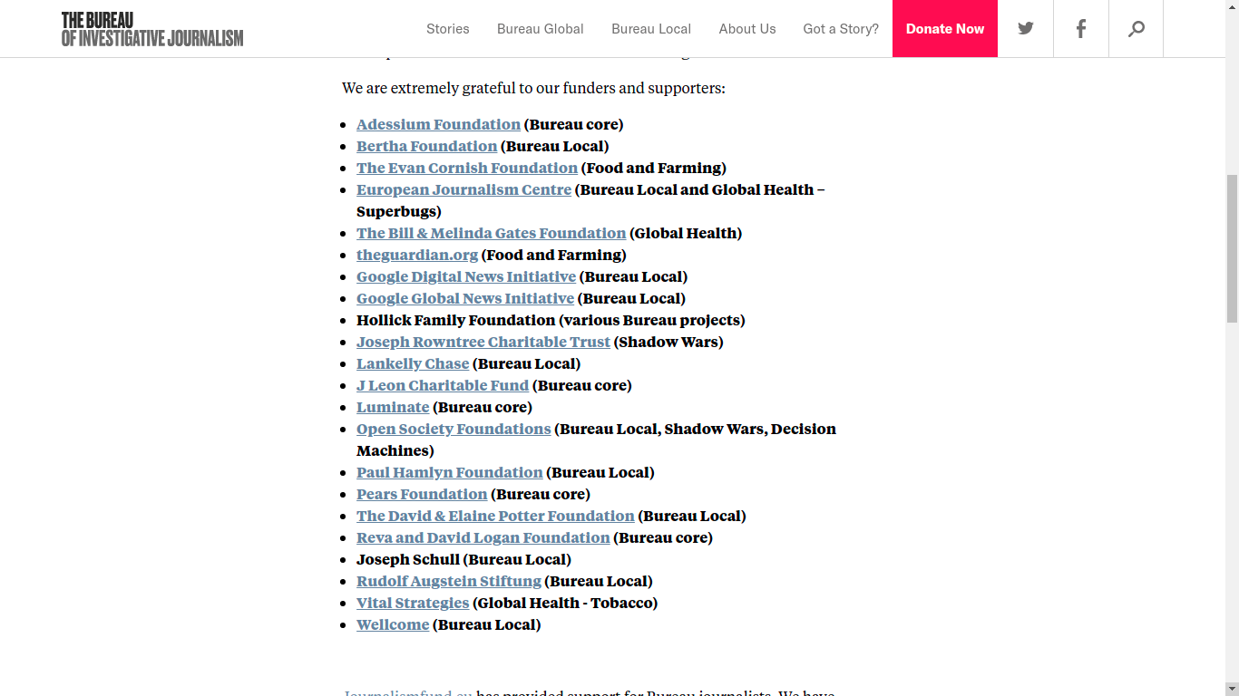 La investigación que revela este costado de la firma Pfizer y que publica el medio peruano, Ojo Público, forma parte a su vez del Bureau of Investigative Journalism, una entidad periodística con sede en Londres y que es auspiciado a su vez por, entre otros, la Bill and Melinda Gates Foundation y la Open Society Foundations, por lo que no se debe descartar que la información, si bien fidedigna, sea también parte de una guerra entre corporaciones farmacéuticas y/o pases de factura a nivel global entre gigantes corporativos.