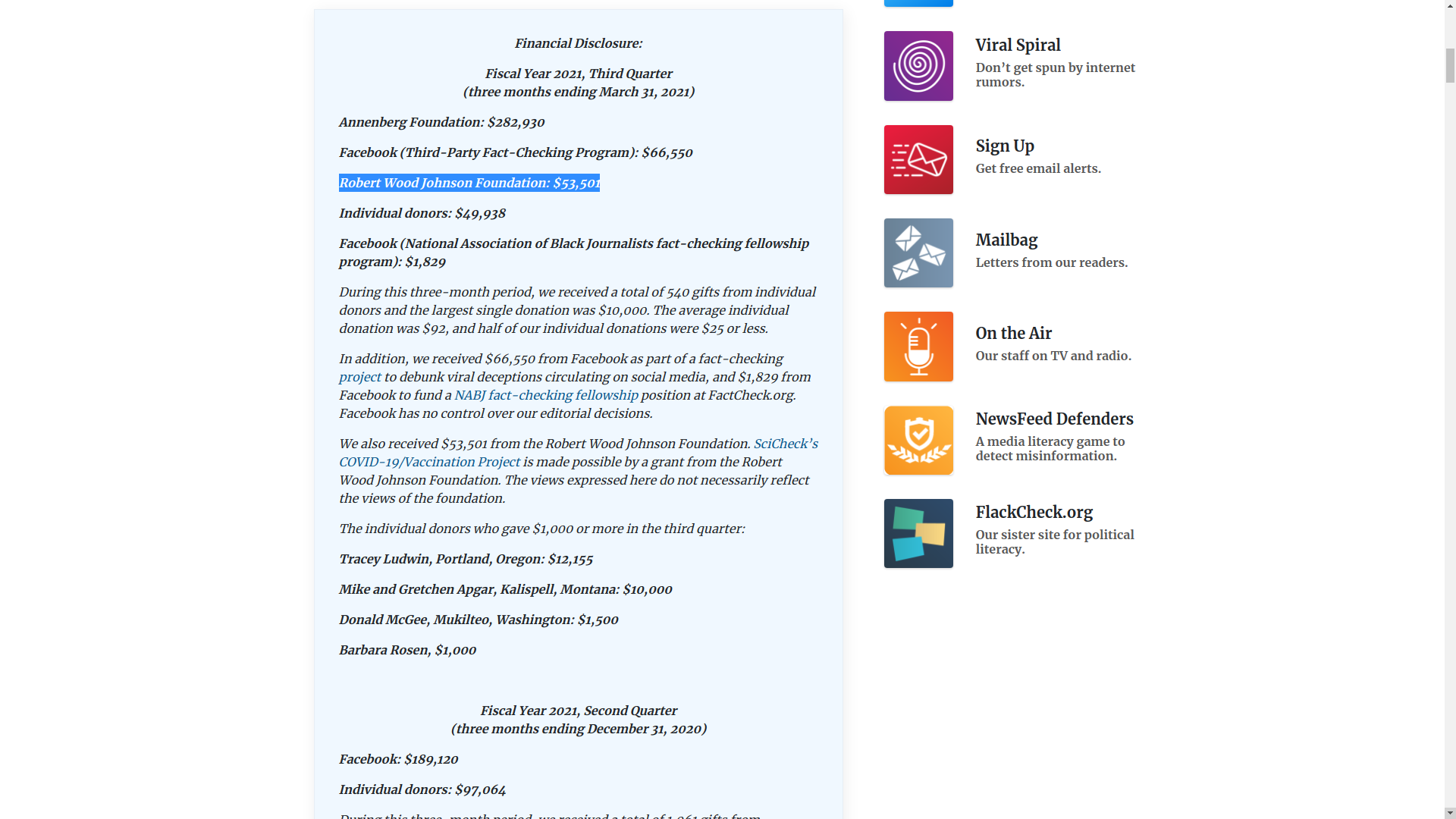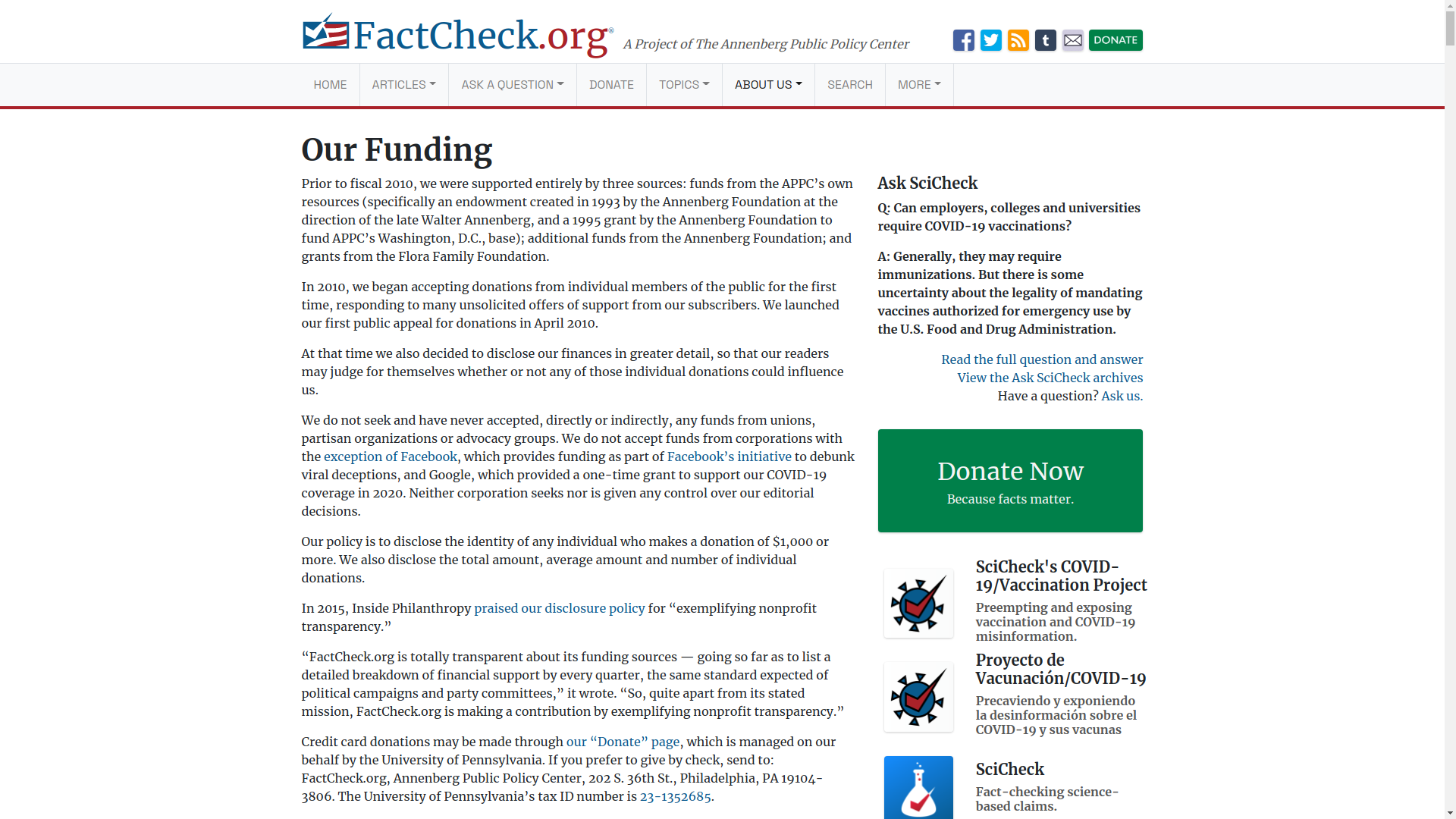 El sitio explica que SciCheck «COVID-19 / Proyecto de vacunación, es posible gracias a una subvención de la Fundación Robert Wood Johnson». SciCheck es una sección del sitio web FactCheck que dice «se centra exclusivamente en afirmaciones científicas falsas y engañosas que hacen los partidarios para influir en las políticas públicas».
