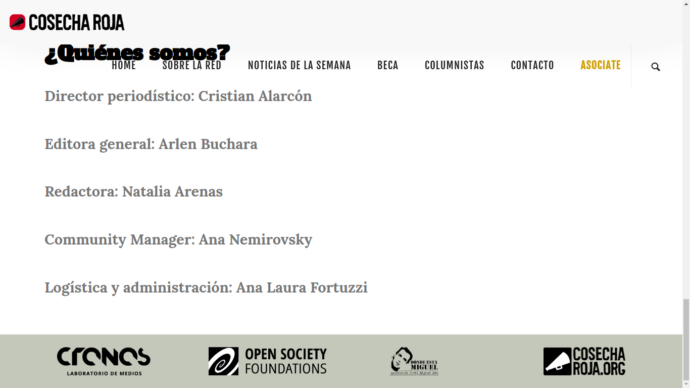 En el caso de Cosecha Roja, no se oculta el aporte fundamental de la Open Society Foundations, emplazando su logotipo al pie de todas sus notas. «Cosecha Roja es un medio de comunicación que propone pensar la violencia y la seguridad desde una perspectiva amplia, con una visión donde prevalecen los derechos humanos y la igualdad de género. Cosecha Roja es, además, una red de intercambio y formación de periodistas judiciales de América Latina. Desde su inicio el sitio planteó el acompañamiento en el trabajo cotidiano y la formación de periodistas, además de proponer la ampliación de la agenda del periodismo judicial a temas que exceden la nota roja tradicional», sostiene en su página institucional.