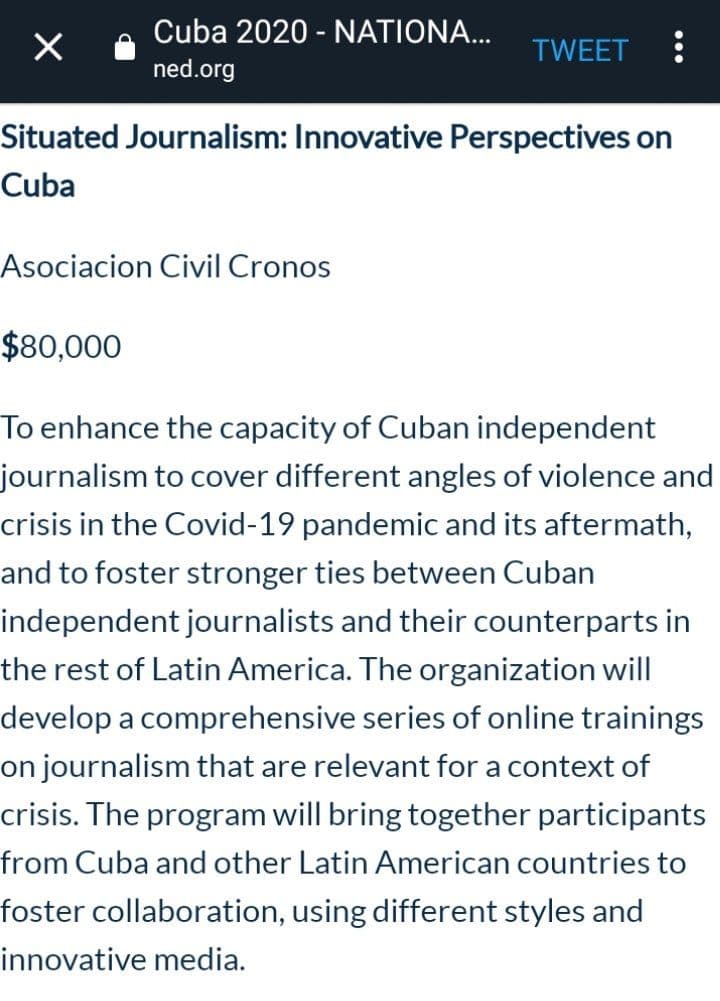 Según el sitio web oficial de la NED el objetivo de la financiación a Cronos Lab, la entidad responsable de editar Anfibia y Cosecha Roja es “mejorar la capacidad del periodismo independiente cubano para cubrir diferentes ángulos de violencia y crisis en la pandemia Covid-19 y sus secuelas» así como también «fomentar lazos más fuertes entre los periodistas independientes cubanos y sus contrapartes en el resto de América Latina. La organización desarrollará una serie integral de capacitaciones en línea sobre periodismo que sean relevantes para un contexto de crisis. El programa reunirá a participantes de Cuba y otros países de América Latina para fomentar la colaboración, utilizando diferentes estilos y medios innovadores”.