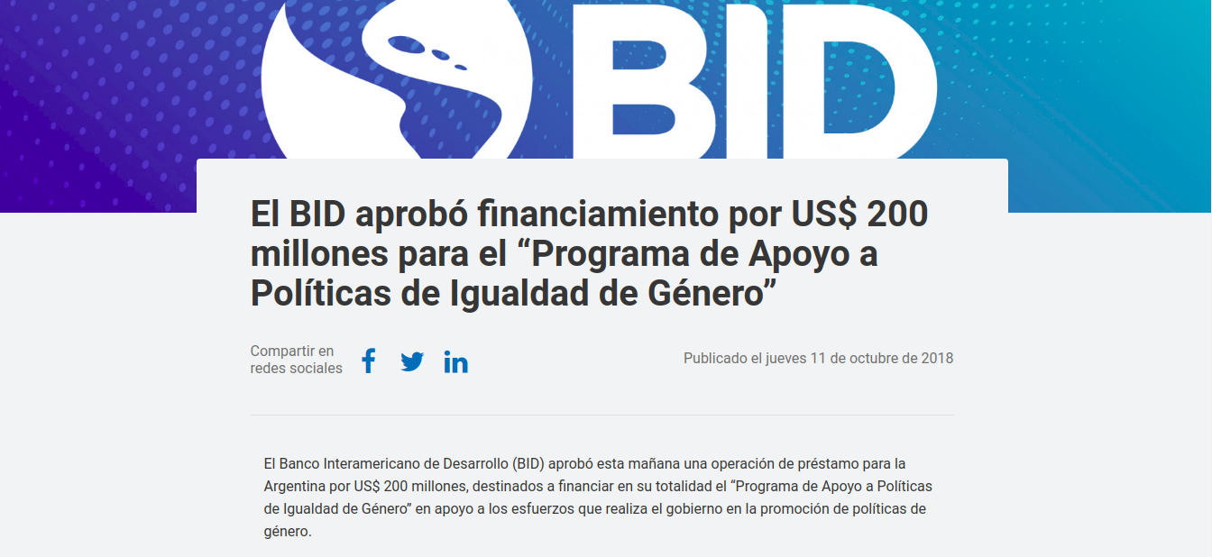 Todas estas disposiciones a su vez se enmarcan en los requerimientos de organismos internacionales como el Banco Mundial y el Banco Interamericano de Desarrollo (BID), el que ya le dio un crédito a la Argentina para temas de género por U$S 200 millones de dólares.