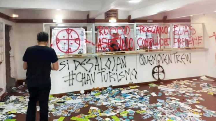 Tras la decisión judicial de desalojar de un predio que la autodenominada comunidad mapuche «Lof Quemquemtreu» ocupa desde mediados de septiembre, un grupo de encapuchados vandalizó la oficina de informes turísticos de El Bolsón, intentó tomar el edificio y amenazó al personal que atendía a los turistas. “Si desalojan, chau turismo”, escribieron como amenaza los atacantes en las paredes del edificio municipal, para luego refrendar la idea en la plaza: «El turismo mata».