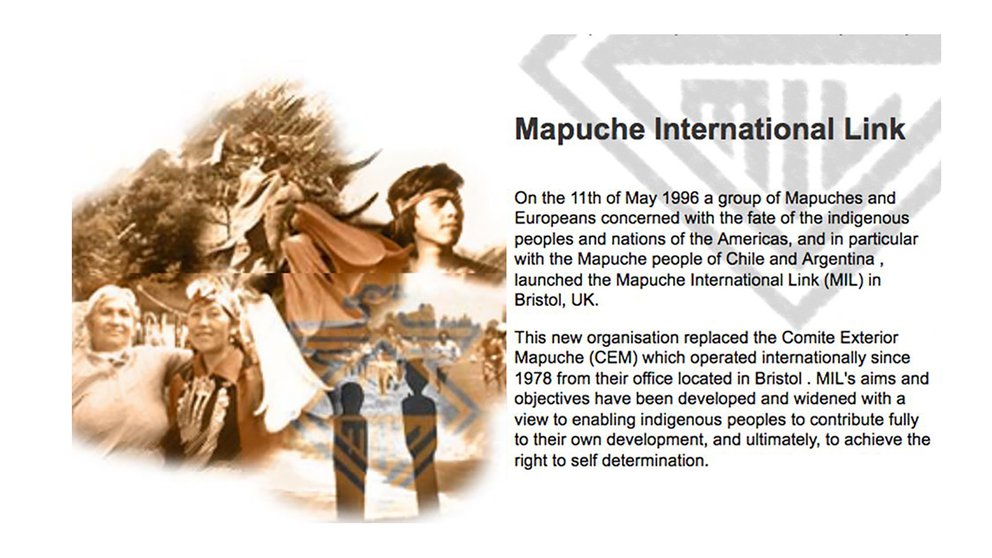 «El día 11 de mayo de 1996, un grupo de mapuches y europeos comprometidos con el destino de los pueblos y naciones indígenas de las Américas, y en particular con el pueblo mapuche de Chile y Argentina, lanzaron la Mapuche International Link (MIL) en Bristol, United Kingdom», explica la organización. Las autoridades no parecen de origen indígena: Edward James (Relaciones Públicas), Colette Linehan (administradora), Madeline Stanley (coordinadora de Voluntarios), Fiona Waters (a cargo del equipo de Derechos Humanos), entre otros. Reynaldo Mariqueo, el único mapuche, es presentado como secretario general secundado por Dame-Nina Saleh Ahmed, vice secretaria general. La organización actual remplaza al «Comité Exterior Mapuche» que, casualmente, tambièn «opera internacionalmente desde 1978 a partir de su oficina ubicada en Bristol».