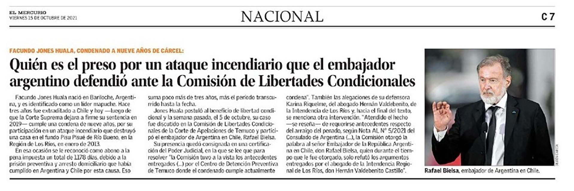 Jonas Huala tiene condena de nueve años por ser responsable de un atentado a una casa de la región de Los Ríos en el año 2013. La sentencia fue confirmada por la Corte Suprema de Chile en 2019. Luego de 1178 días que incluye el tiempo en el que estuvo en prisión domiciliaria en Argentina, el líder mapuche busca aferrarse al derecho de la libertad condicional. Cabe recordar que la abogada defensora en la Argentina de Jones Huala fue la actual ministra de «Mujeres, Género y Diversidad» y ex miembro del CELS, Elizabeth Gómez Alcorta. La relación de Gómez Alcorta con el CELS no es casual, la entidad, liderada por otro ex dirigente de Montoneros, Horacio Verbitsky, mantiene desde hace años la financiación de la Embajada Britànica en la Argentina, el British Council y ONGs internacionales pantalla de servicios de inteligencia como la Open Society de George Soros.