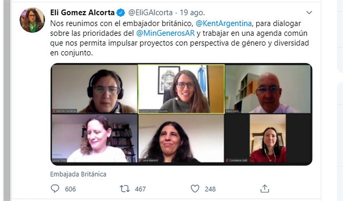 En lo que va del año ya realizaron alegres reuniones con el embajador Mark Kent, tanto presenciales como virtuales, entre otros: la titular del INADI, Victoria Donda; la titular del «Ministerio de las Mujeres, Géneros y Diversidad», Elizabeth Gómez Alcorta; el ministro de Salud, Ginés González García; el propio canciller, Felipe Solá; entre otros.