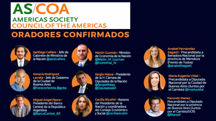 Este jueves 26 de agosto se realizará el encuentro anual del Council of the Americas en Buenos Aires, tradicional encuentro del poder económico, organizado por AS/COA, entidad fundada por David Rockefeller. El tema de este 2021 será «Argentina: perspectivas económicas y políticas» y se confirmaron las participaciones de dirigentes y candidatos tanto del gobernante «Frente de Todos» como del macrismo de «Juntos».