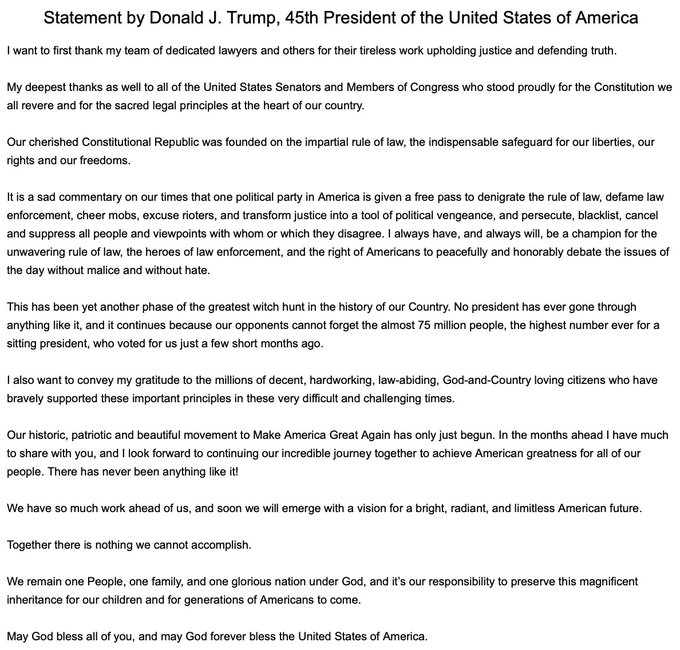 «Esta ha sido una fase más de la mayor caza de brujas en la historia de nuestro país. Ningún presidente ha pasado por algo así, y continúa porque nuestros oponentes no pueden olvidar a los casi 75 millones de personas, la cifra más alta para un presidente en funciones, que votó por nosotros hace unos pocos meses», agregó el exmandatario.