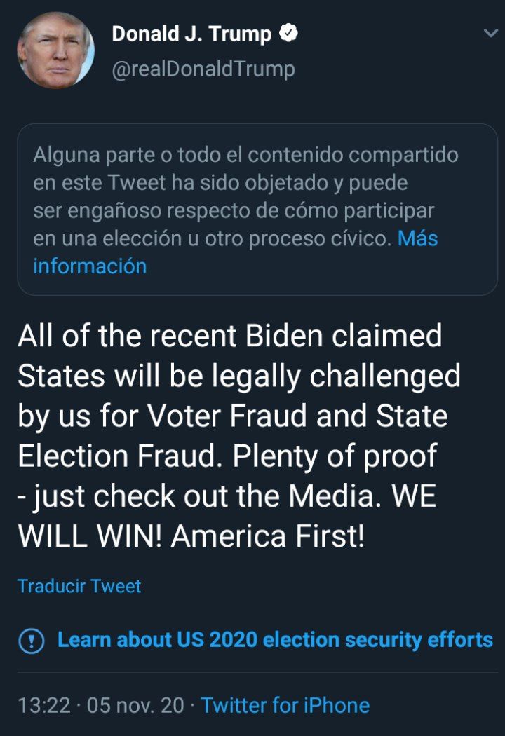 “Todos los Estados recientemente reclamados por Biden serán confrontados legalmente por nosotros por fraude electoral y fraude electoral estatal”, escribió Trump en Twitter, y añadió: “Muchas pruebas, solo consulten los medios. ¡Ganaremos! ¡America First!”.