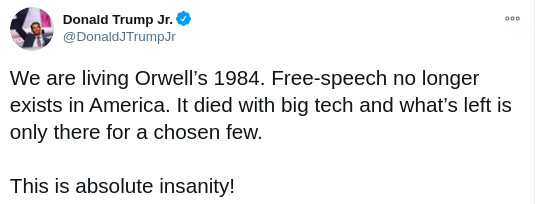 Uno de los hijos de Trump, pudo, por el momento, expresar sus quejas: «Estamos viviendo el 1984 de Orwell. La libertad de expresión ya no existe en Estados Unidos. Murió con la gran tecnología y lo que queda es solo para unos pocos elegidos. ¡Esto es una locura absoluta!».