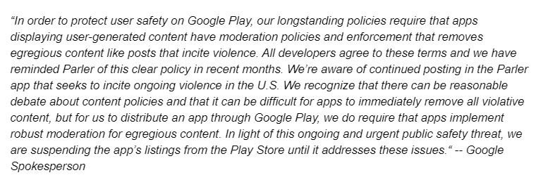 Ante la noticia de que Trump abriría una cuenta en la red social Parler, competidora de Twitter, se supo que la corporación Apple amenazó a Parler con aplicar censura o de lo contrario la quitaría de su plataforma de aplicaciones. Lo mismo hizo Google Play Store.