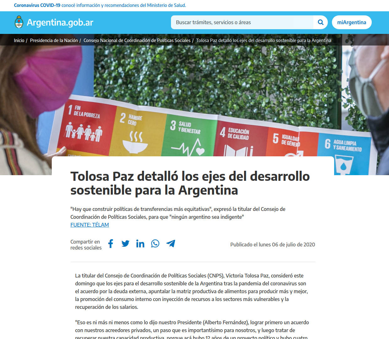 Tolosa Paz destacó en julio de 2020 que «todas las medidas económicas de emergencia desplegadas por el Estado para enfrentar las consecuencias negativas de la pandemia están alineadas con los 17 Objetivos de Desarrollo Sostenible (ODS) contemplados en la Agenda 2030 adoptada por la Organización de las Naciones Unidas (ONU), a la que la Argentina adhiere y que el Gobierno del presidente Fernández aplica concretamente».