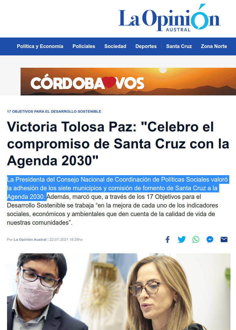 La Presidenta del Consejo Nacional de Coordinación de Políticas Sociales viene siendo el eslabón clave en la implementación de la Agenda 2030 en las distintas provincias y municipios. El 22 de julio de este año consiguió la adhesión de los siete municipios de Santa Cruz a la Agenda 2030. Tolosa Paz recordó la firma compromiso de la provincia de Santa Cruz para la adhesión a la Agenda 2030 que tuvo lugar durante el 2020. “Recuerdo que hace un año atrás firmamos la adhesión en el marco de una Argentina que vuelve a buscar el sentido de crecimiento. Por eso celebro el compromiso de Santa Cruz, con todo el equipo que acompaña, en entender que esta agenda es una responsabilidad nacional, de dos Estados, en este caso de los Estados que integran las Naciones Unidas”, expresó.